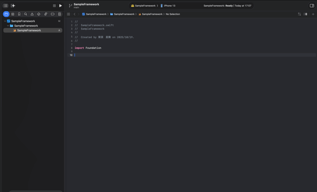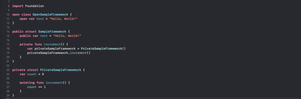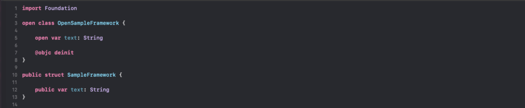 importしたSampleFrameworkの中身を確認すると下記のような定義となっています。privateなものは見えないようになっていることが分かります。