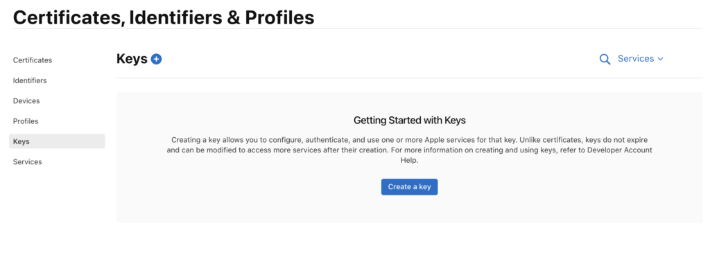 Certificates, Identifiers & ProfilesのページのKeysからCreate a Keyを選択します。