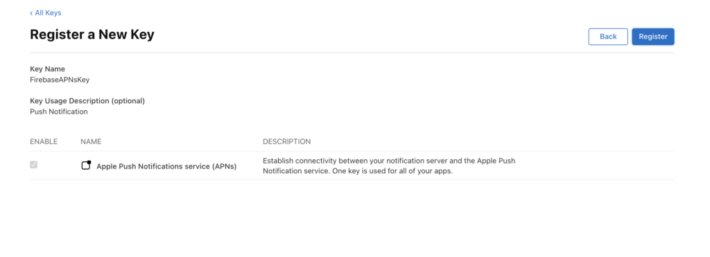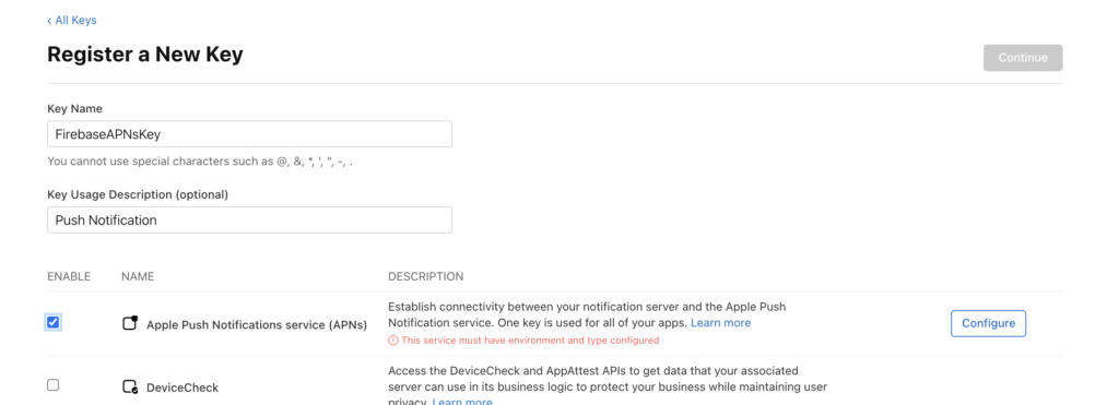 Saveすると前の画面に戻るのでContinueを押して先に進みます。確認画面が出てくるのでRegisterをタップしてAPNsキーを登録します。