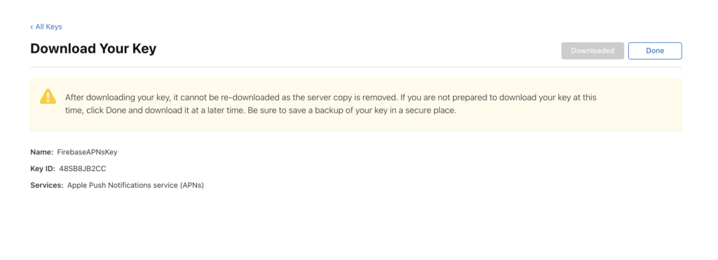 登録が完了するとAPNsキーをダウンロードすることができます。ダウンロードは1度しかできないため大切に保管しておきます。