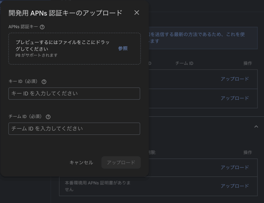 ダウンロードしたAPNsキーを元にFirebaseのプロジェクト設定からアップロードします。