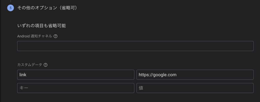 画面遷移用のリンクを設定したい場合はその他のオプションからカスタムデータとして登録する必要がありました。