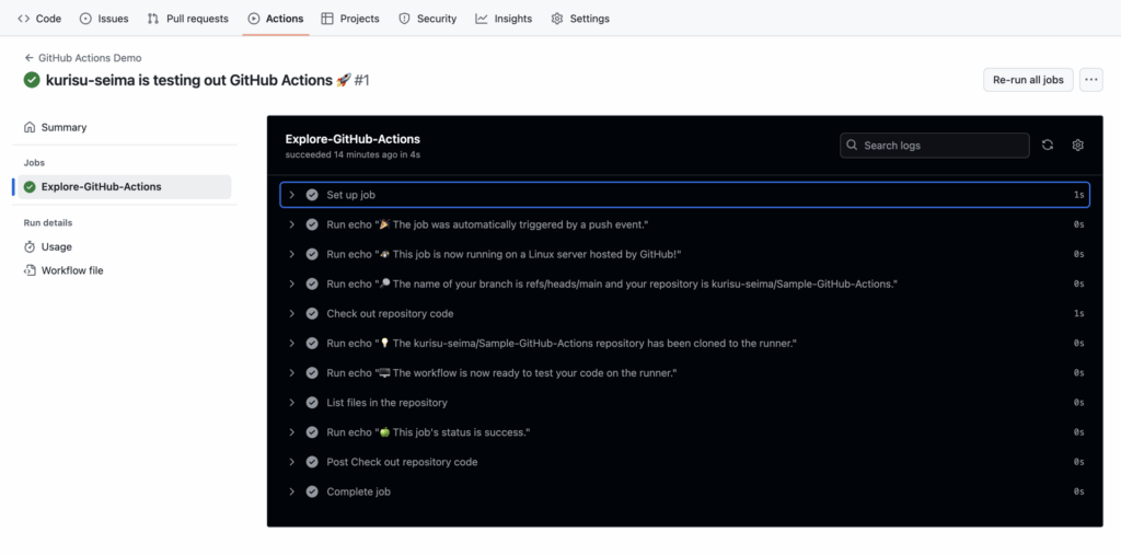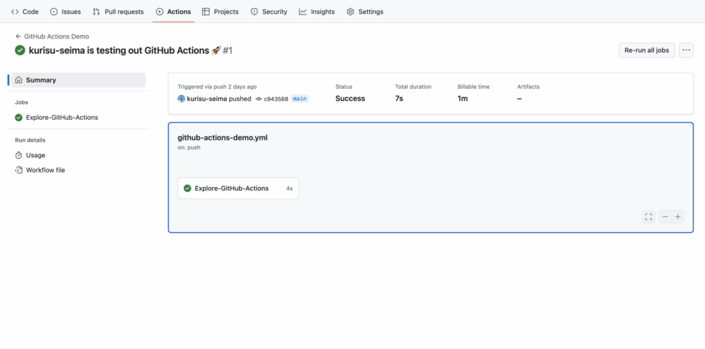 どのブランチで実行されたか、どれくらい前に実行されたかなど確認できます。