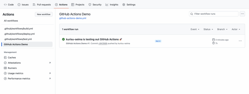 GitHubは常に.github/workflowsディレクトリを監視しているためymlファイルが追加されればActionsに自動で表示されます。
