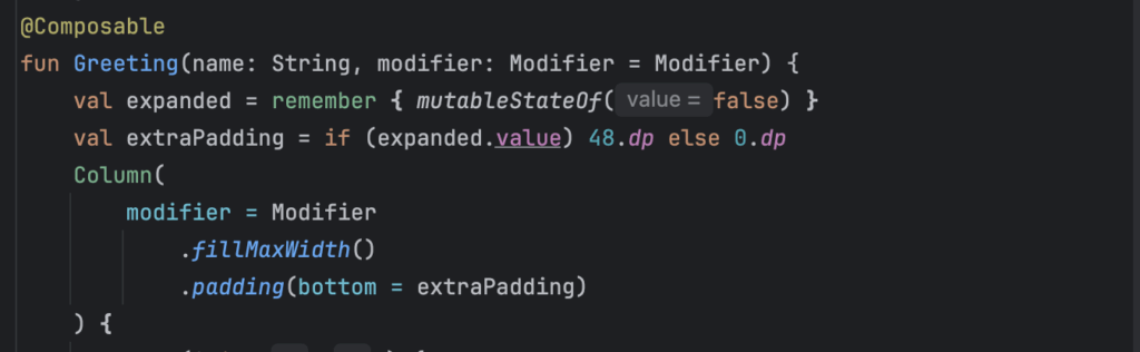 ModifierはUI要素に対して親レイアウト内での配置、表示、動作を指示します。Paddingなどを設定したい場合はModifier.paddingを利用します。そのほかにも位置揃え、アニメーション化、配置、変換、クリック可能、スクロール可能にするなど様々なものがあります。